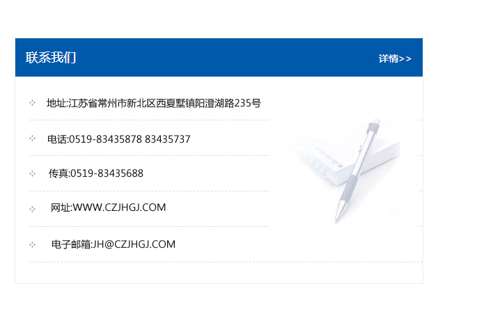 地址:常州市新北區友邦商務大廈1幢16、17層  電話:0519-85101652  傳真:0519-85112595  郵編:213022  網址:www_cz-jiayue_cn.zhongyuanweiyehr.com  郵箱:xiajifengaa@163.com